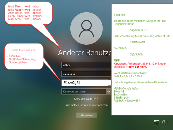 - Das Password wird weder unter, an oder auf die Tastatur, Monitor, Schublade oder ähnliches geklebt.